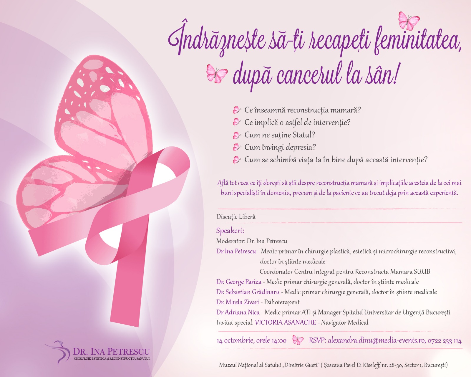 În preambulul Zilei Internaționale a Reconstrucției Mamare, marcată anual pe data de 16 octombrie, pacientele cu cancer la sân care au trecut printr-o intervenție de reconstrucție mamară, dar și medicii (chirurgi generalisti, chirurgi plasticieni, psihoterapeuți) care le-au ajutat, vor sta de vorbă cu femeile care vor să afle mai multe despre pașii ce trebuie urmați pentru a beneficia de o reconstrucție mamară, ce presupune aceasta și toate detaliile esențiale pentru a-și reîntregi trupul devastat de cancerul la sân. Evenimentul va avea loc pe data de 14 octombrie, începând cu orele 14.00, la Muzeul Național al Satului ”Dimitrie Gusti” (Șos. Kiseleff nr. 28- 30, București), reprezentând un efort comun de conștientizare a importanței recâștigării feminității prin reconstrucție la standarde internaționale, cu ajutorul unei comisi multidisciplinare.