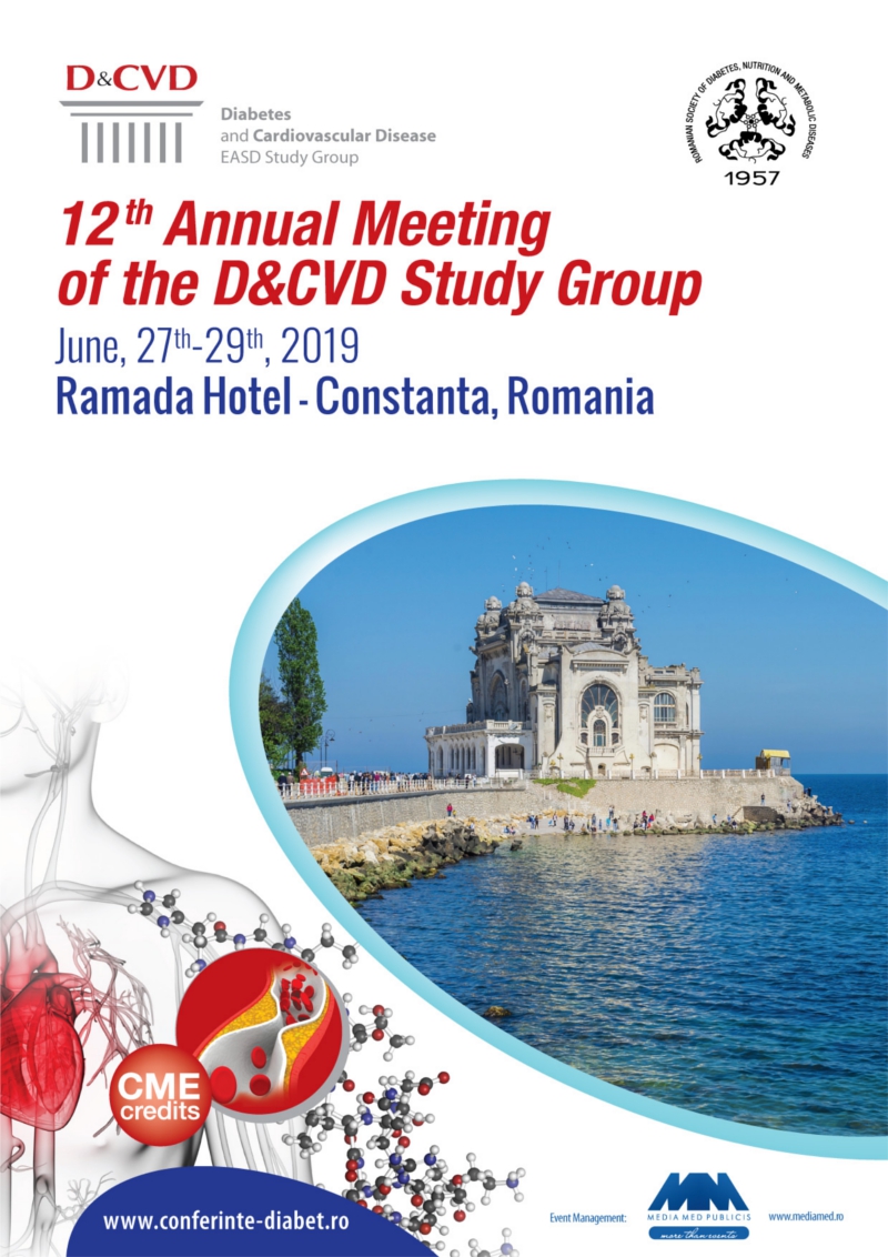 Afisari: 2104Societatea Romana de Diabet, Nutritie si Boli Metabolice, EASD Study Group Diabetes and Cardiovascular Disease organizeaza in perioada 27-29 iunie 2019, la Hotel Ramada, Constanta, Cea de-a 12-a Intalnire Anuala a Grupului de Studiu D&CVD. Eveniment creditat cu ore de Educație Medicală Continuă.
