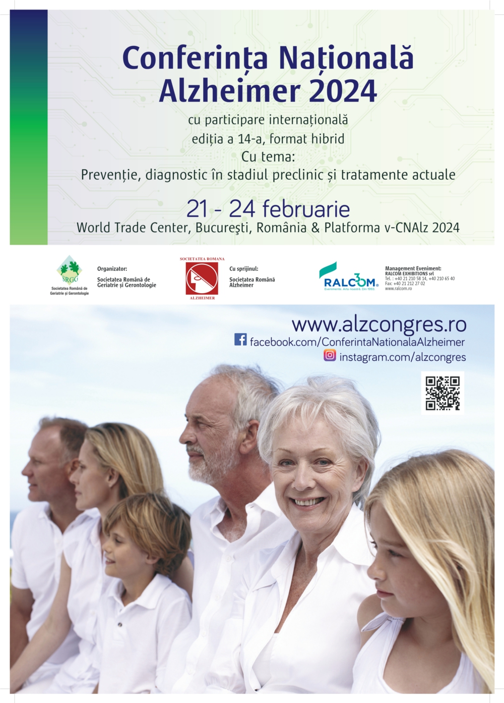 Avem plăcerea de a vă invita la cea de-a 14-a ediție a Conferinței Naționale Alzheimer, care va avea loc în perioada 21- 24 februarie 2024 la World Trade Center, București și se va desfășura în format hibrid, respectiv atât cu participare directă cât și online, în platforma dedicată v-CNAlz 2024.