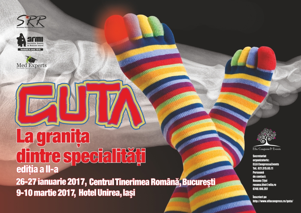 Afisari: 2616Societatea Romana de Reumatologie, Societatea Romana de Medicina Interna si Asociatia MedExperts au placerea de a va invita la cea de-a II-a editie a conferintei nationale Guta la granita dintre specialitati, ce va avea loc la IASI, in perioada 9-10 martie 2017, la Hotel Unirea