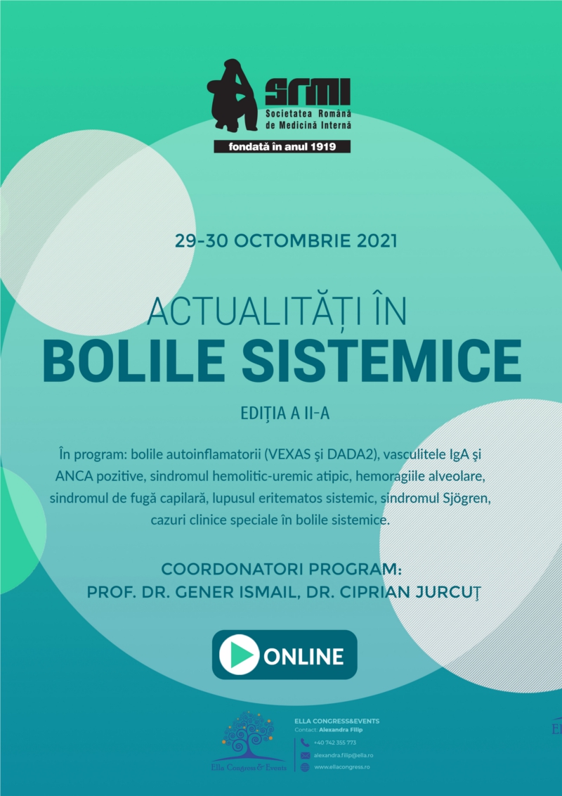 În program: bolile autoimune (VEXAS și DADA2), vasculitele IgA și ANCA pozitive, sindromul hemolitic-uremic atipic, hemoragiile alveolare, sindromul de fugă capilară, lupusul eritematos sistemic, sindromul Sjogren, cazuri clinice speciale în bolile sistemice.