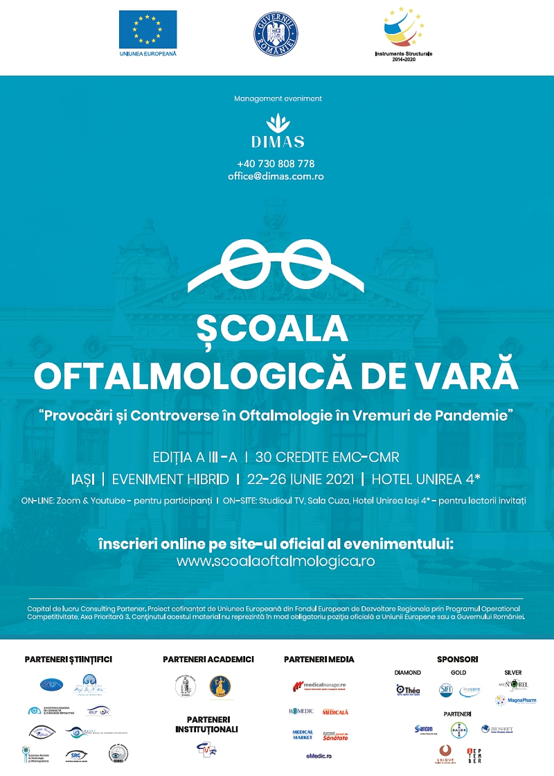 Nu uitați să marcați în calendarul activităților dumneavoastră zilele de 22-26 iunie 2021, ca fiind ocupate cu sesiunile științifice ale celei de a III-a ediții a Școlii Oftalmologice de Vară din România.