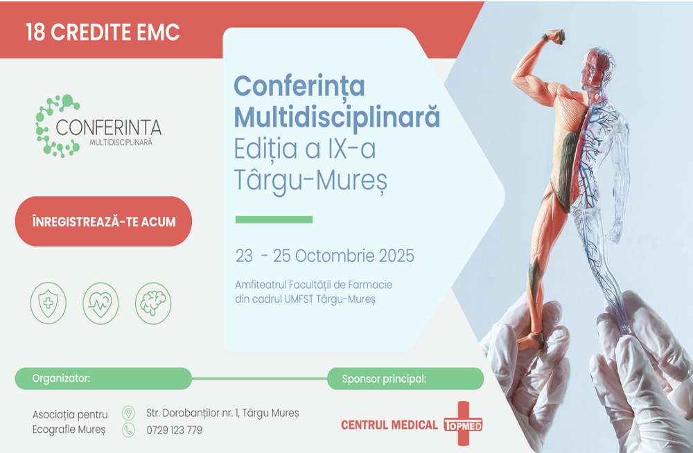 Am deosebita plăcerea de a vă invita să participați la o nouă întâlnire multidisciplinară pe care o organizăm anual. A IX-a Conferință Multidisciplinară este organizată de Asociația pentru Ecografie Mureș, cu sprijinul Centrului Medical Topmed, în parteneriat cu UMFST Târgu-Mureș și Colegiul Medicilor din județul Mureș.
