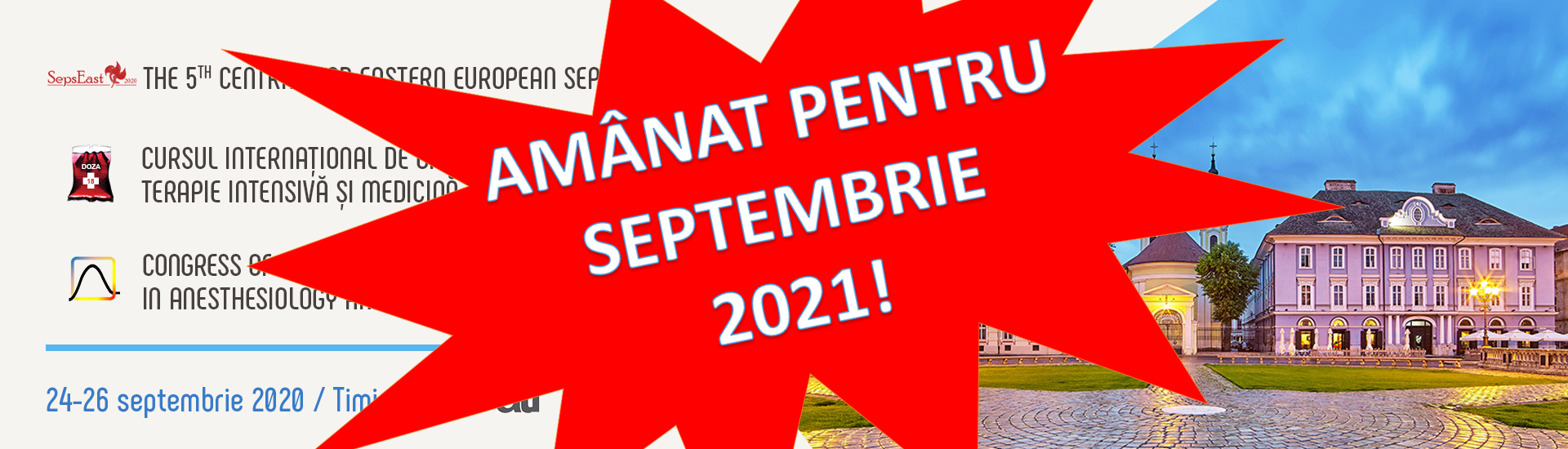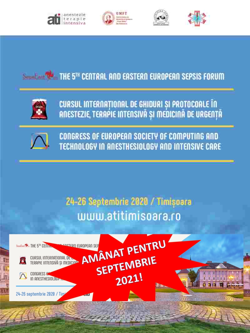 Dorim să vă informăm asupra faptului că am decis ca ediția 2020 a Cursului Internaţional de Ghiduri şi Protocoale în Anestezie, Terapie Intensivă şi Medicină de Urgenţă să fie amânată pentru septembrie 2021.