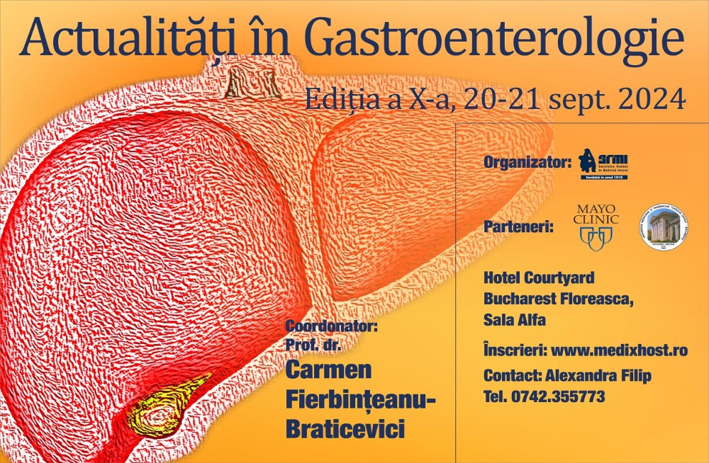 Suntem încântați să deschidem înscrierile la cea de a X-a ediție a conferinței "Actualități în gastroenterologie", un eveniment organizat de Societatea Română de Medicină Internă în colaborare cu Mayo Clinic.