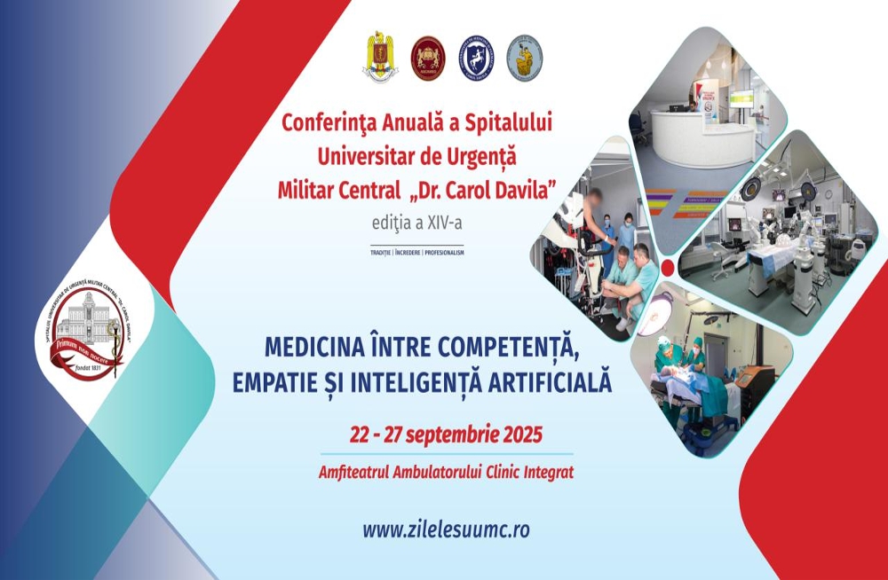 Am o mare bucurie ȋn a vă anunţa desfăşurarea celei de-a XIV-a ediţii a Conferinţei Spitalului Universitar de Urgenţă Militar Central “Dr. Carol Davila” cu tema “Medicina între competență, empatie și inteligență artificială”. Aceasta va avea loc ȋn perioada 22-27 septembrie 2025, ȋn moderna şi generoasa ambianţă a amfiteatrelor din Ambulatoriul Spitalului Militar Central şi din Institutul de Medicină Aeronautică. Trăim ȋntr-o lume dominată de emergenţa de noi conflicte şi de reaşezări ale relaţiilor internaţionale. Spitalul Universitar de Urgenţă Militar Central participă activ la consolidarea şi dezvoltarea sistemului de apărare național. O astfel de misiune nu poate fi ȋndeplinită decȃt prin perfecţionare continuă şi ridicarea permanentă a standardelor medico-militare, atȃt prin prisma valorilor europene cȃt şi prin cea a apartenenţei şi participării noastre la sistemul de securitate euroatlantic.