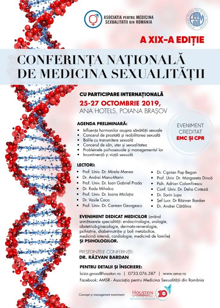 Asociaţia pentru Medicina Sexualităţii din România (AMSR) și compania de comunicare medicală Houston NPA vor organiza în perioada 25-27 octombrie 2019 la Ana Hotels, din Poiana Brașov, cea de-a XIX-a ediţie a Conferinţei Naţionale de Medicina Sexualităţii, un eveniment multidisciplinar și interactiv care se adresează medicilor având specialitățile: endocrinologie, urologie, obstetrică-ginecologie, dermato-venerologie, psihiatrie, diabet-nutriție și boli metabolice, medicină internă, medicină de familie, precum și psihologilor.