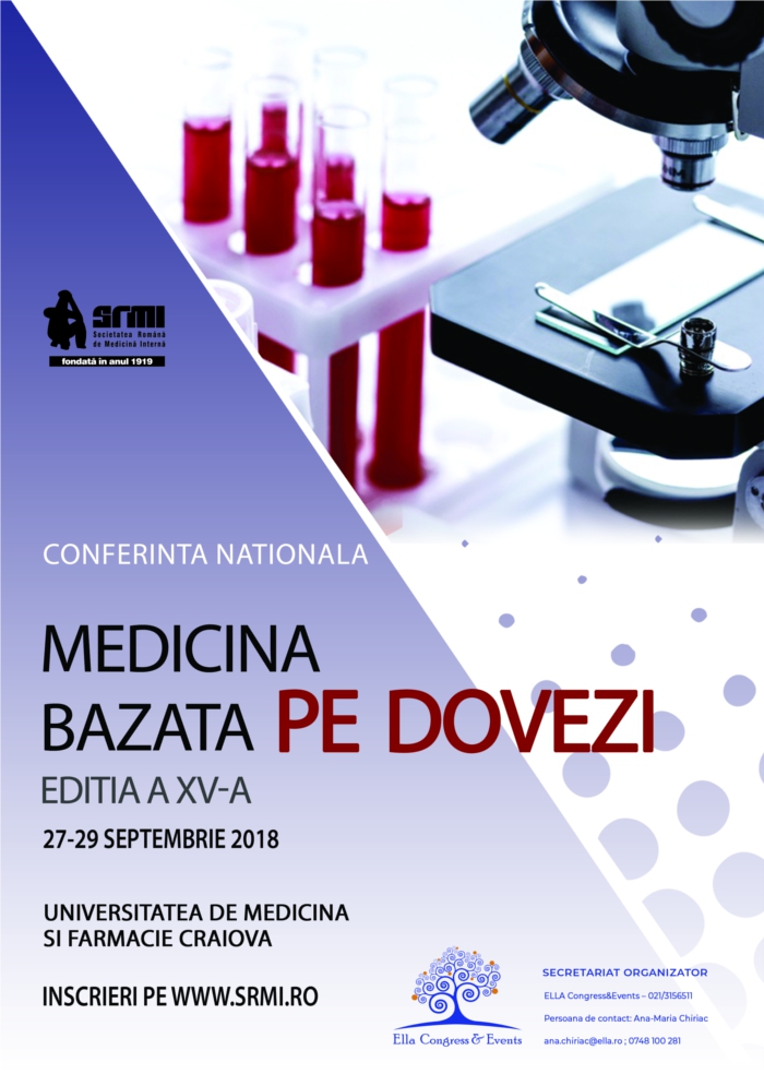 În perioada 27 - 30 septembrie 2018, Societatea Română de Medicină Internă va organiza la Universitatea de Medicina si Farmacie cea de-a 15-a ediţie a Conferinţei Naţionale “Medicina Bazată pe Dovezi”, întâlnire ştiinţifică ce se va bucura de prezenţa a peste 300 de medici (medici specialişti, rezidenţi, medici primari, şefi de secţie, profesori şi şefi de catedră).
