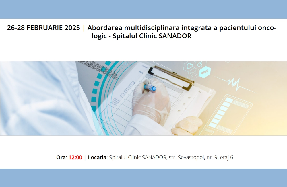 Organizator: https://agomedia.ro/26-28-februarie-2025-abordarea-multidisciplinara-integrata-a-pacientului-oncologic-spitalul-clinic-sanador/