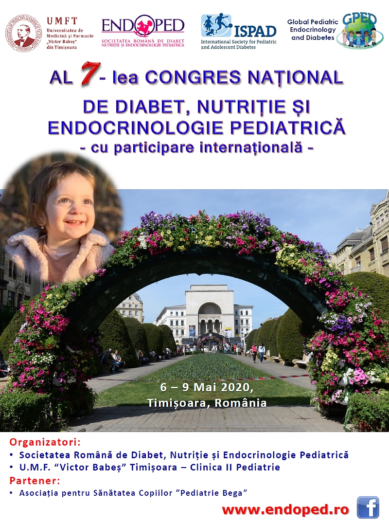 În numele Comitetului de Organizare, vă adresăm invitația de a participa la Al 7-lea Congres Naţional de Diabet, Nutriţie şi Endocrinologie Pediatrică - cu participare internaţională care se va desfășura, la Timişoara, în perioada 6 – 9 Mai 2020.