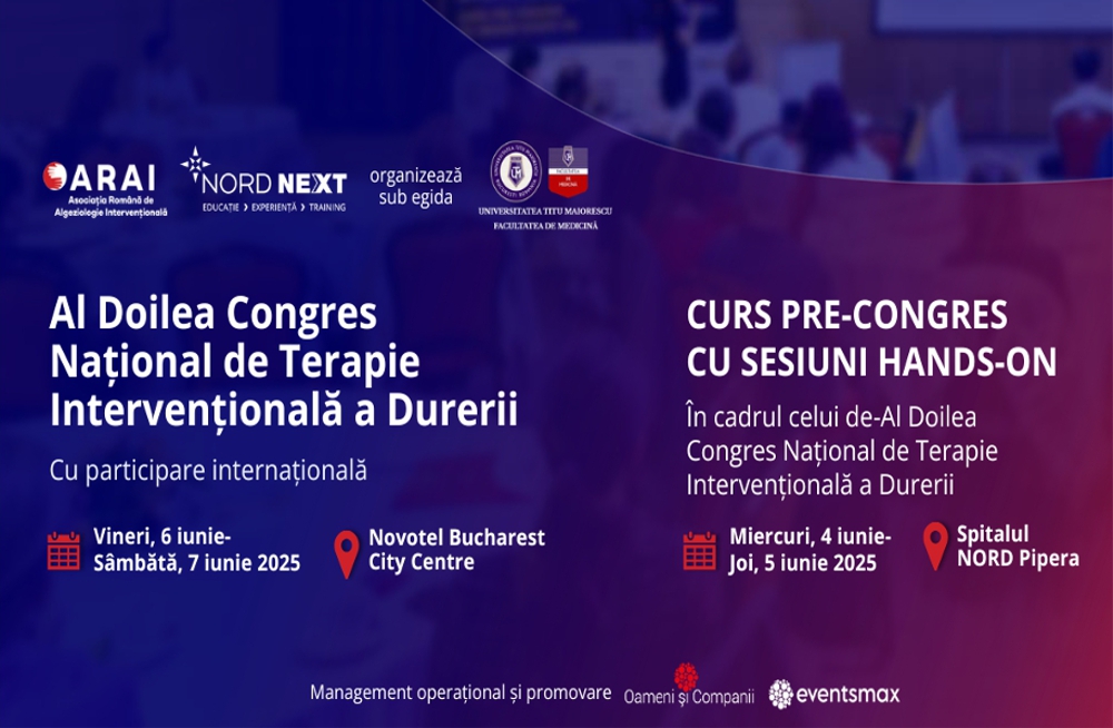 În perioada 6-7 iunie 2025, România va fi gazda celui de-Al Doilea Congres Național de Terapie Intervențională a Durerii, organizat de ARAI – Asociația Română de Algeziologie Intervențională și NORD NEXT: Educație-Experiență-Training, sub egida Facultății de Medicină, Universitatea Titu Mariorescu București. Congresul va avea loc la Novotel Bucharest City Centre.