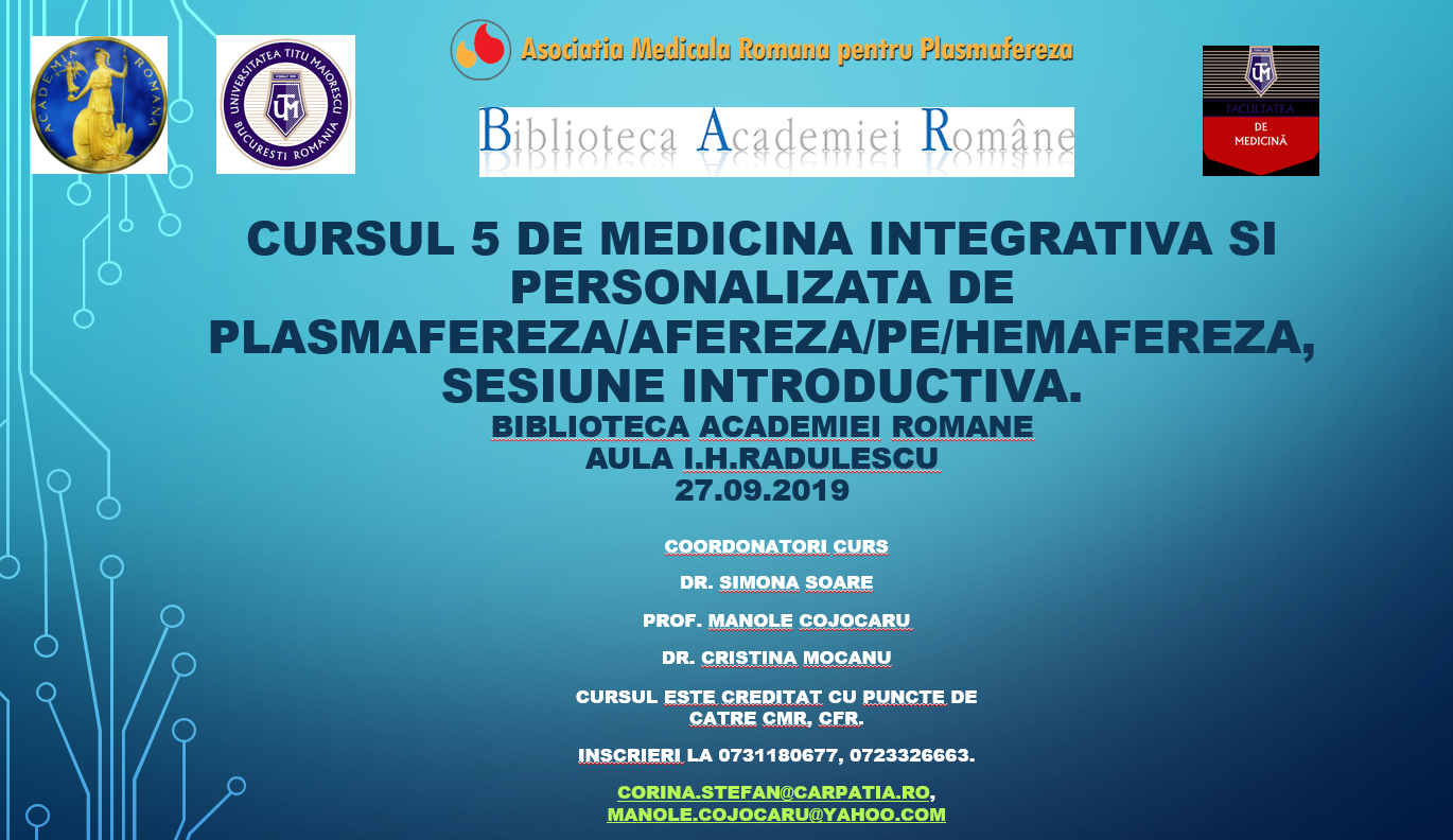 CURSUL 5 DE MEDICINA INTEGRATIVA SI PERSONALIZATA DE PLASMAFEREZA /AFEREZA/PE/HEMAFEREZA, sesiune introductiva