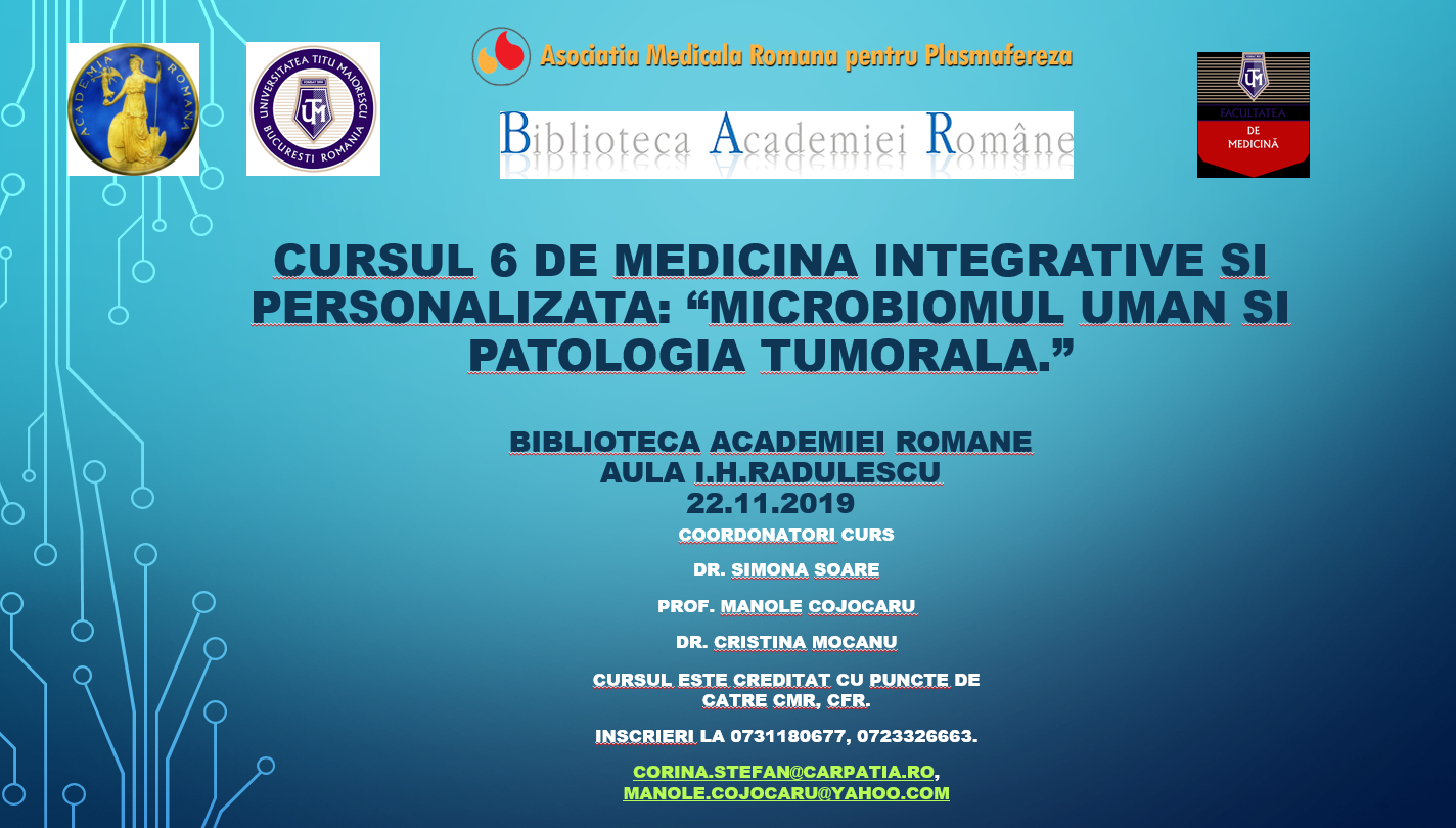 Asociatia Medicala Romana pentru Plasmafereza impreuna cu Facultatea de Medicina a Universitatii "Titu Maiorescu" din Bucuresti, va invita sa participati in data de 22.11.2019 la:Cursul 6 de medicina integrativa si personalizata: "MICROBIOMUL UMAN SI PATOLOGIA TUMORALA."