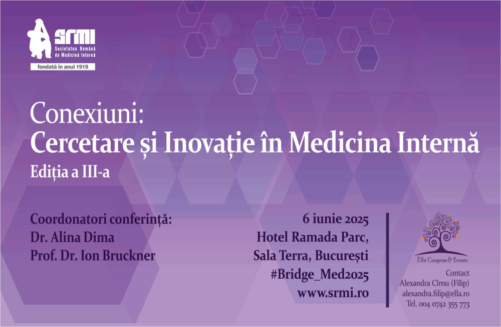 Societatea Română de Medicină Internă SRMI vă invită să participați la o nouă ediție a evenimentului “Conexiuni: Cercetare și Inovație în Medicină Internă/ Bridging the Gap: Research and Innovation in Internal Medicine” (#Bridge_Med2025), care va avea loc în format fizic pe 6 iunie 2025, la Hotel Ramada Parc – Sala Terra, București.