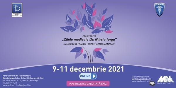 Asociaţia Medicilor de Familie București-Ilfov (AMFB) şi Patronatul Medicilor de Familie București-Ilfov (PMFB), mereu alături unii de ceilalți, așa cum v-au obișnuit, au deosebita plăcere să vă invite la Conferinţa „Zilele Medicale Dr. Mircia Iorga” - Medicul de Familie - Practician şi Manager, care se va desfăşura în perioada 9-11 decembrie 2021, ONLINE.