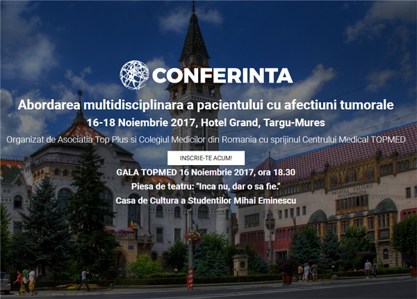 Conferinţa: Abordarea multidisciplinară a pacientului cu afecţiuni tumorale, organizată la Tg.Mureş, în perioada 16-18 Noiembrie 2017 de către Asociaţia TopPlus şi Colegiul Medicilor din Judeţul Mureş, cu sprijinul Centrului Medical TOPMED.