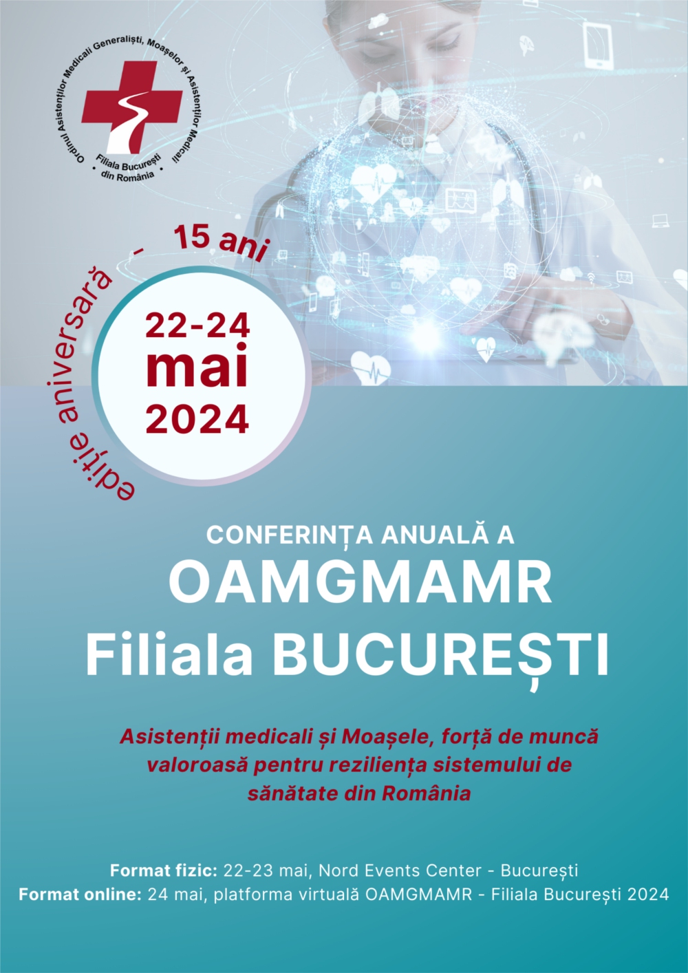 Conferința anuală și internațională ajunsă la cea de-a XV-a ediție, vine în atenția dumneavoastră cu titlul „Asistenții medicali și Moașele, forță de muncă valoroasă pentru reziliența sistemului de sănătate din România” și este deja un eveniment marcant în calendarul anual de evenimente naționale dedicate Zilei Internaționale ale Asistenților Medicali (12 mai) și Moașelor (5 mai) construit în jurul unei tematici actuale și provocatoare.