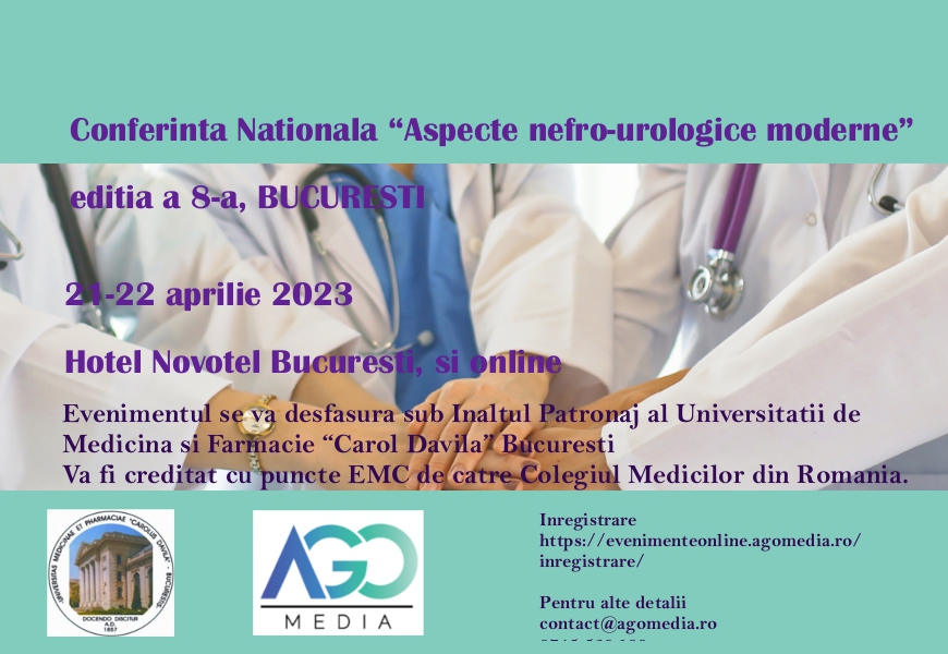 AGOMedia va invita sa participati la Conferinta Nationala “Aspecte nefro-urologice moderne”, editia a 8-a ce va avea loc in perioada 21-22 aprilie 2023, atat la Hotel Novotel Bucuresti, cat si online.