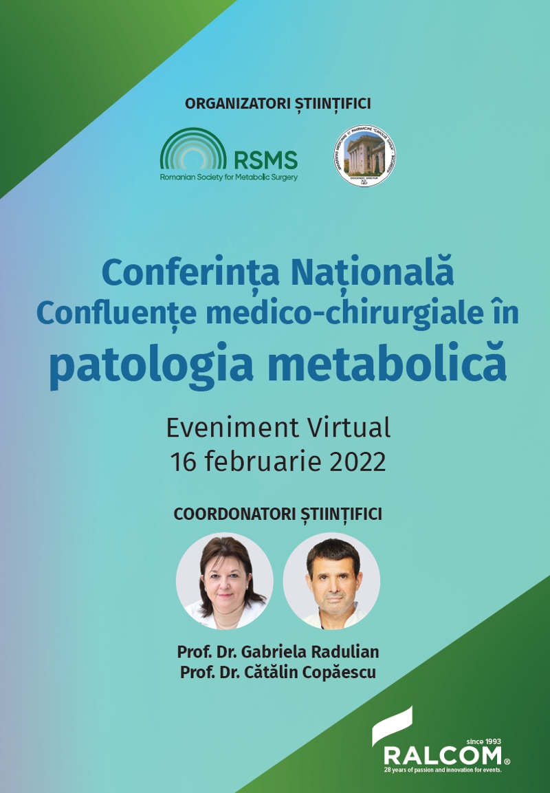 Vă invităm cu bucurie la prima ediție a Conferinței Naționale „Confluențe medico chirurgicale în patologia metabolică” ce se va desfășura în data de 16 februarie 2022, în format online.