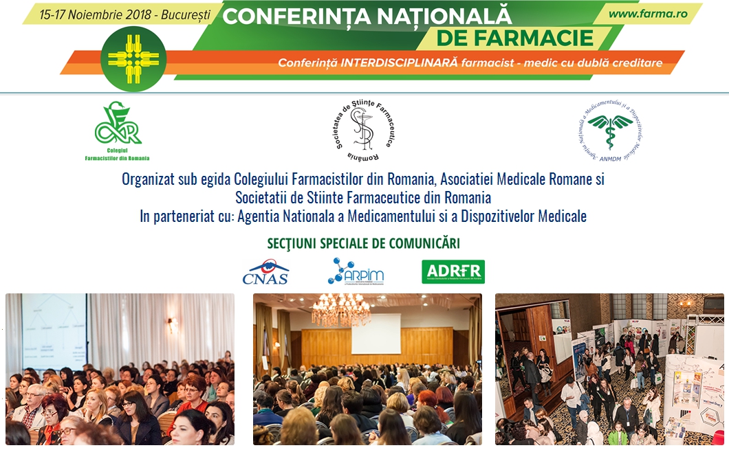 Avem placerea de a va invita sa participati la Conferinta Nationala INTERDISCIPLINARA de FARMACIE, care va avea loc in perioada 15-17 noiembrie 2018, la Bucuresti. In acest an, conferinta va sarbatori aniversarea a 11 ani de organizare sub egida Colegiului Farmacistilor din Romania. De-a lungul celor 11 ani, CN FARMA a jucat un rol cheie, care sta la baza intelegerii mecanismului de colaborare dintre medic si farmacist pentru o terapie cat mai eficienta.