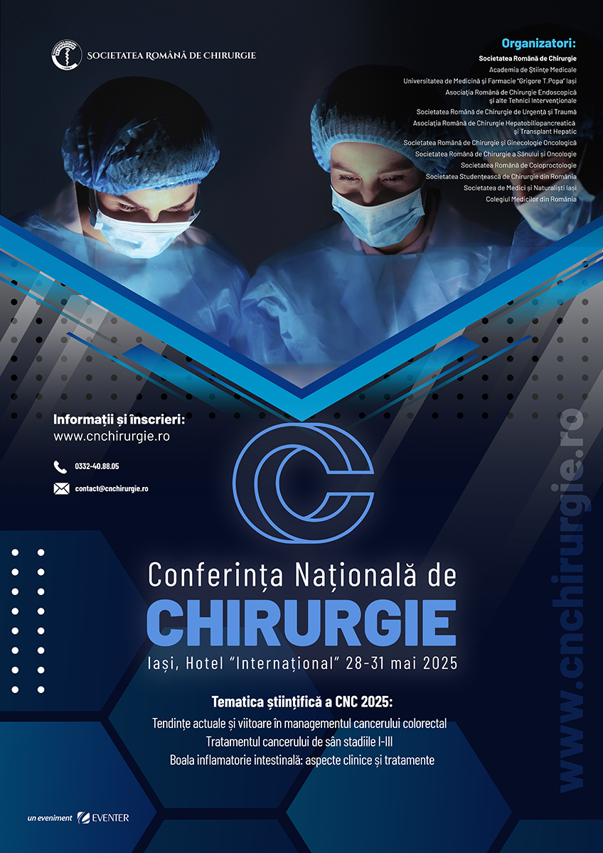 Am deosebita onoare și bucurie să vă invit să participați la Conferința Națională de Chirurgie, ce se va desfășura în perioada 28-31 mai 2025, în Iași, la Hotel Internațional.