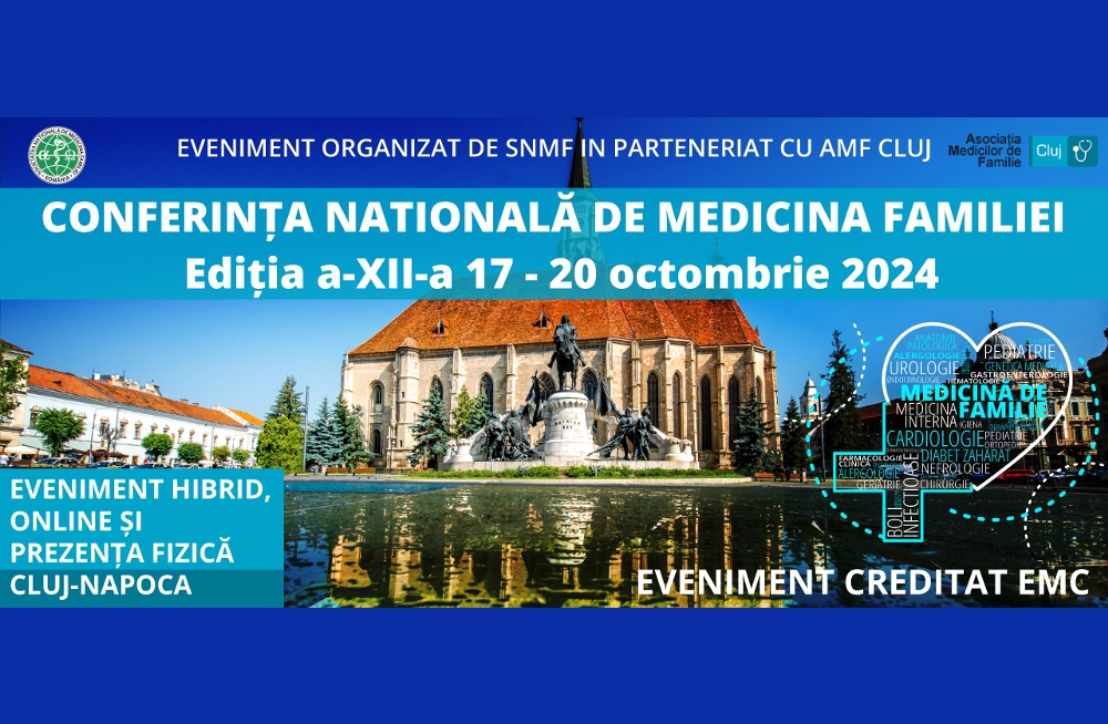Afisari: 1208Asociația Societatea Națională de Medicina Familiei/Medicină Generală (SNMF) în parteneriat cu Asociația Medicilor de Familie Cluj organizează Conferința Națională de Medicina Familiei, eveniment care se va desfășura în perioada 17-20 octombrie 2024 in sala de conferinte a hotelului Grand Hotel Napoca, Cluj-Napoca.