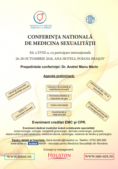 Pentru detalii referitoare la conferinta AMSR, editia 2018, va rugam accesati www.amsr.ro si www.houston.ro, precum si Facebook AMSR- Asociatia pentru Medicina Sexualitatii din Romania.