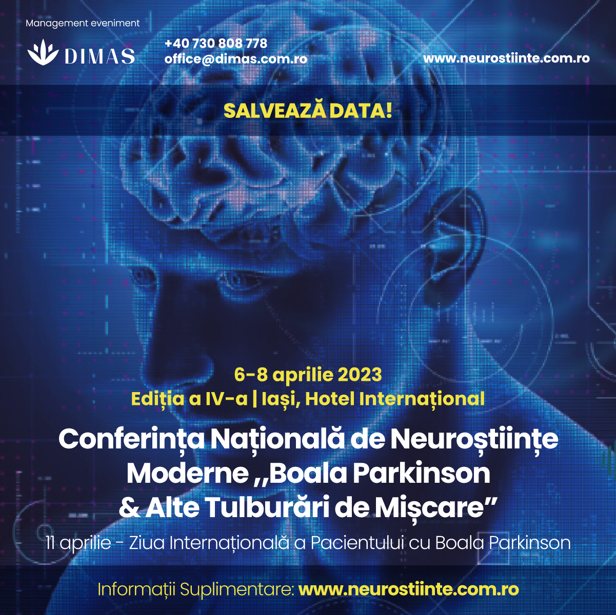 Conferinta Nationala de Neurostiinte Moderne “Boala Parkinson & Alte Tulburari de Miscare”, editia a IV-a, reuneste la Iasi in perioada 6-8 Aprilie 2023, zeci de specialiști din principalele centre medicale si academice romanesti recunoscute si certificate international precum si din Europa