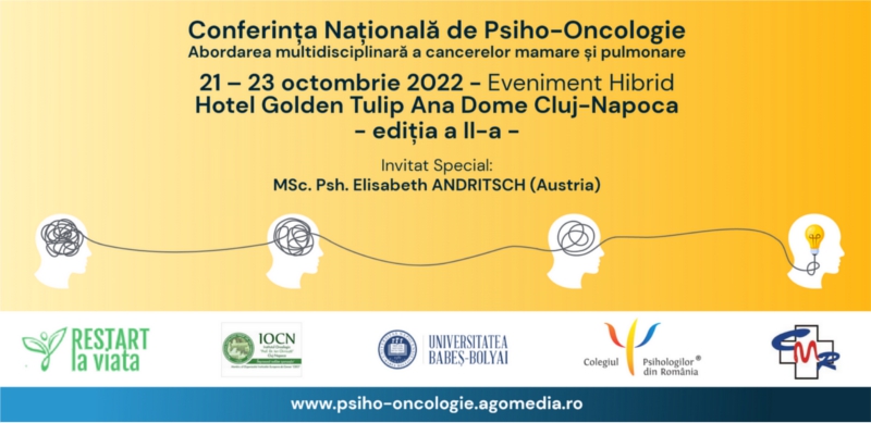 Afisari: 1494A doua editie a Conferintei Nationale de Psiho-Oncologie “Abordarea multidisciplinara a cancerelor mamare si pulmonare” va avea loc in perioada 21-23 octombrie 2022, la Hotel Golden Tulip Ana Dome din Cluj-Napoca si Online.