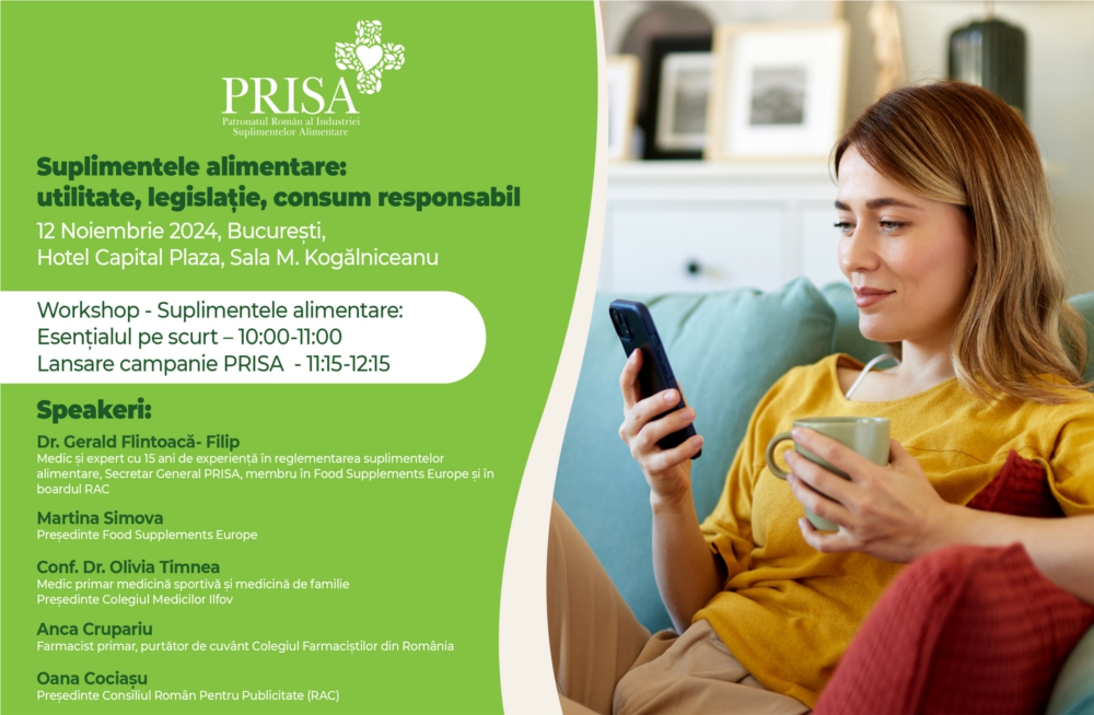 - ora 11:15-12:15, lansare inițiativă PRISA cu privire la utilitate, legislație, consum responsabil de suplimente alimentare