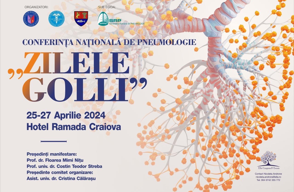 Conferinta de Pneumologie Zilele Golli are loc între 25-27 aprilie, la Craiova, Hotel Ramada si se adresează medicilor cu următoarele specialităţi: pneumologie, medicină internă, medicină de familie, chirurgie toracica, recuperare medicală, diabet, ORL, ATI, gastroenterologie, cardiologie, pediatrie.
