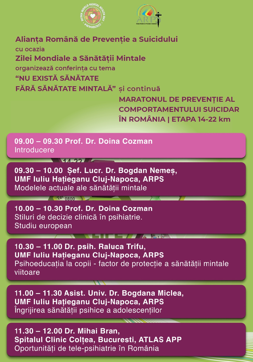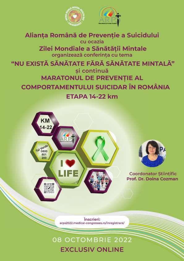 Conferința online – „NU EXISTĂ SĂNĂTATE FĂRĂ SĂNĂTATE MINTALĂ” din cadrul “MARATONULUI DE PREVENȚIE AL COMPORTAMENTULUI SUICIDAR ÎN ROMÂNIA”, 08 Octombrie 2022, in colaborare cu Dna Prof. Dr. Doina Cozman.