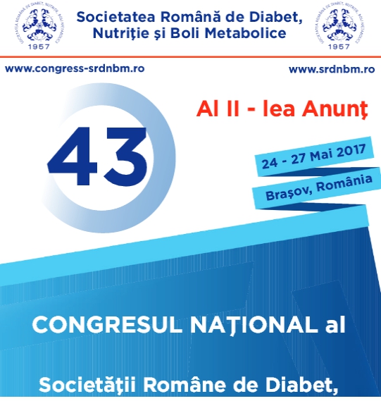 Am deosebita plăcere de a vă invita să participați la cel de-al 43-lea Congres Național al Societății Române de Diabet, Nutriție și Boli Metabolice, care se va desfășura în perioada 24-27 mai 2017, la Hotel Kronwell din Braşov.