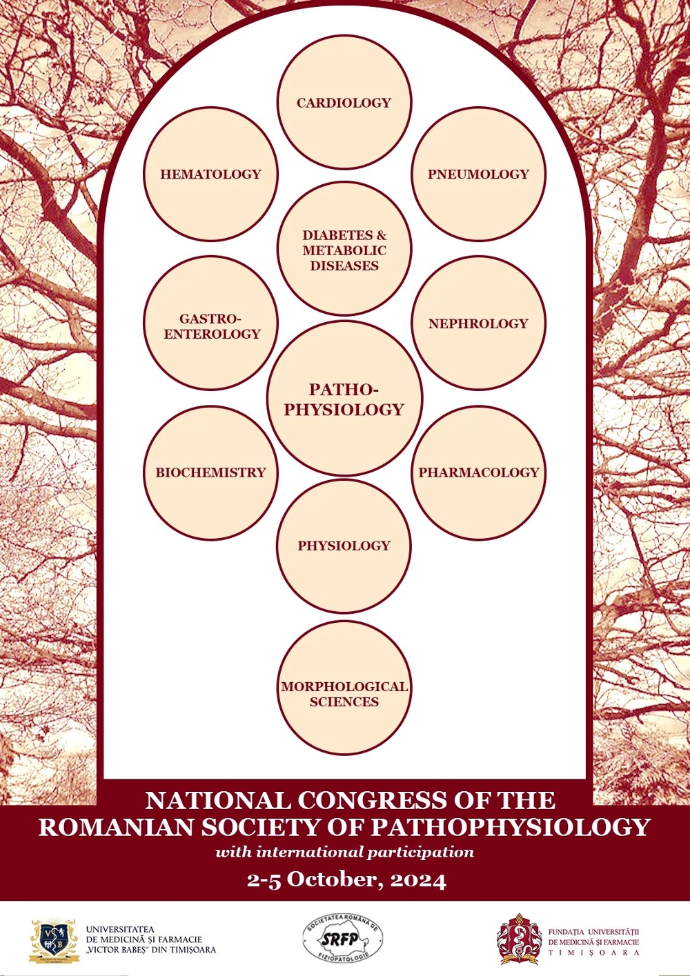 În numele Societății Române de Fiziopatologie și al Comitetului de organizare, avem deosebita plăcere și onoare de a vă invita la Congresul Național al Societății Române de Fiziopatologie, „Tradiție în educație și colaborare în cercetarea interdisciplinară” manifestare ce va avea loc la Timișoara, în perioada 2-5 octombrie 2024, în parteneriat cu Universitatea de Medicină şi Farmacie „Victor Babeș” din Timișoara, sub egida Centrului de Cercetare Translațională și Medicina Sistemelor și cu sprijinul Fundației Universității de Medicină și Farmacie Timișoara.
