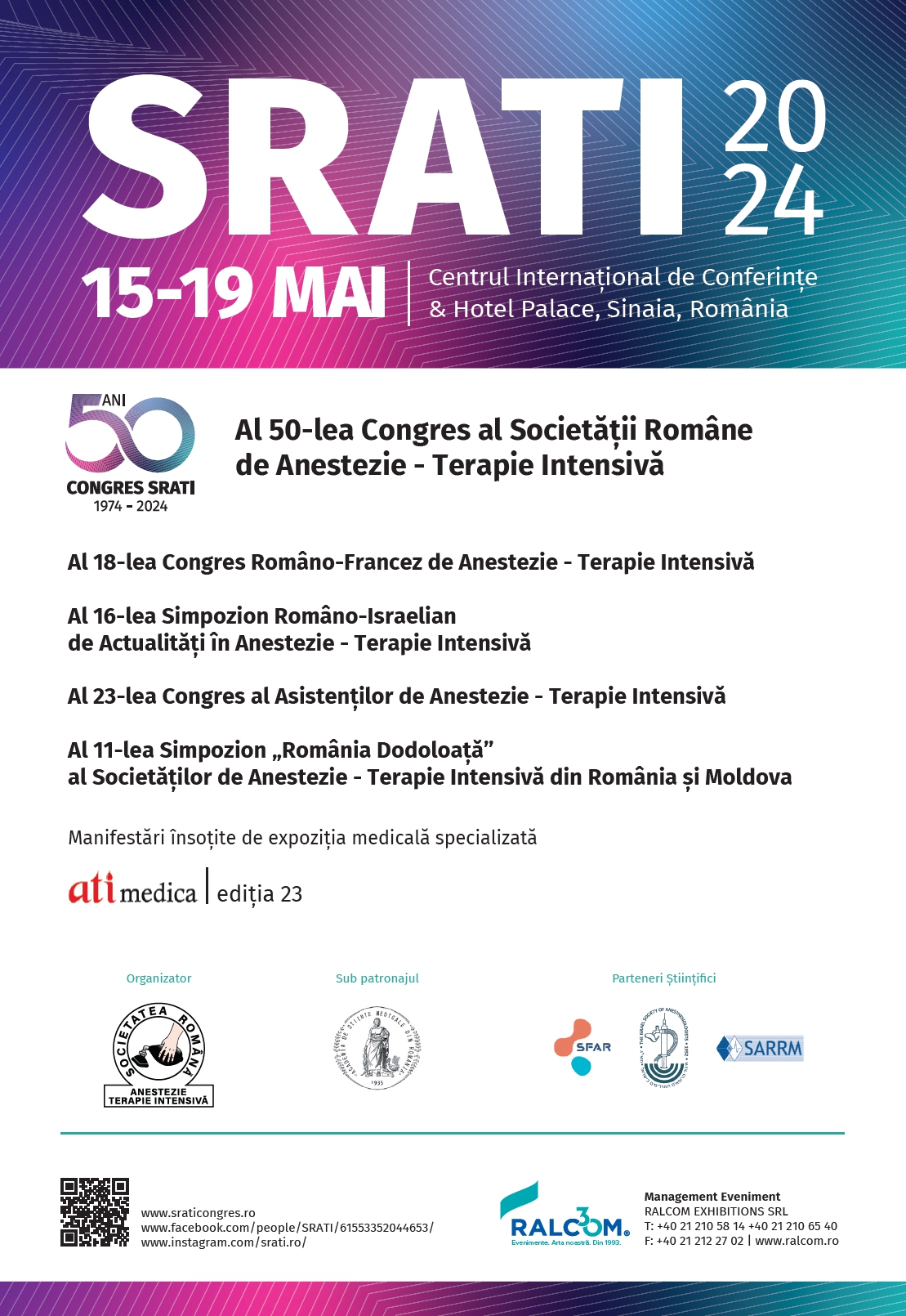 Este o onoare și o bucurie să vă invit să participați la Congresul SRATI 2024, o ediție aniversară cu prilejul căreia sărbătorim organizarea a 50 de congrese naționale ale Societății Române de Anestezie și Terapie Intensivă. Astfel, în perioada 15 – 19 mai 2024, vom celebra acest moment de referință din istoria SRATI la Centrul Internațional de Conferințe, Sinaia, o destinație devenită deja emblematică pentru comunitatea noastră.