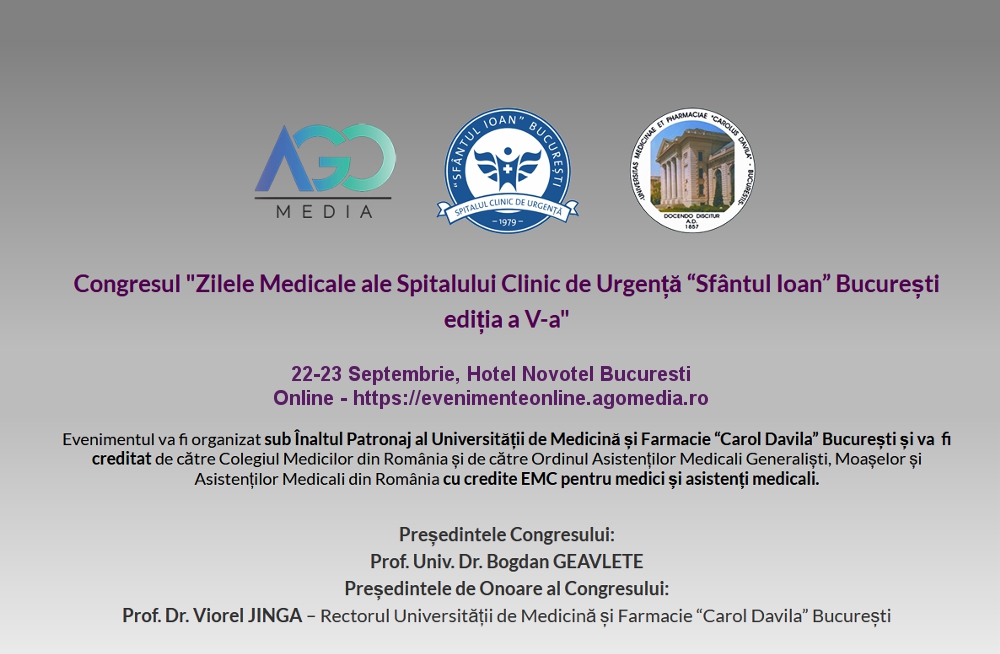 Afisari: 1566SCU “Sf. Ioan” organizează Congresul “Zilele Medicale ale Spitalul Clinic de Urgență Sf. Ioan București”, editia a V-a, ce va avea loc in perioada de 22-23 Septembrie la Hotel Novotel Bucuresti si Online pe https://evenimenteonline.agomedia.ro/.