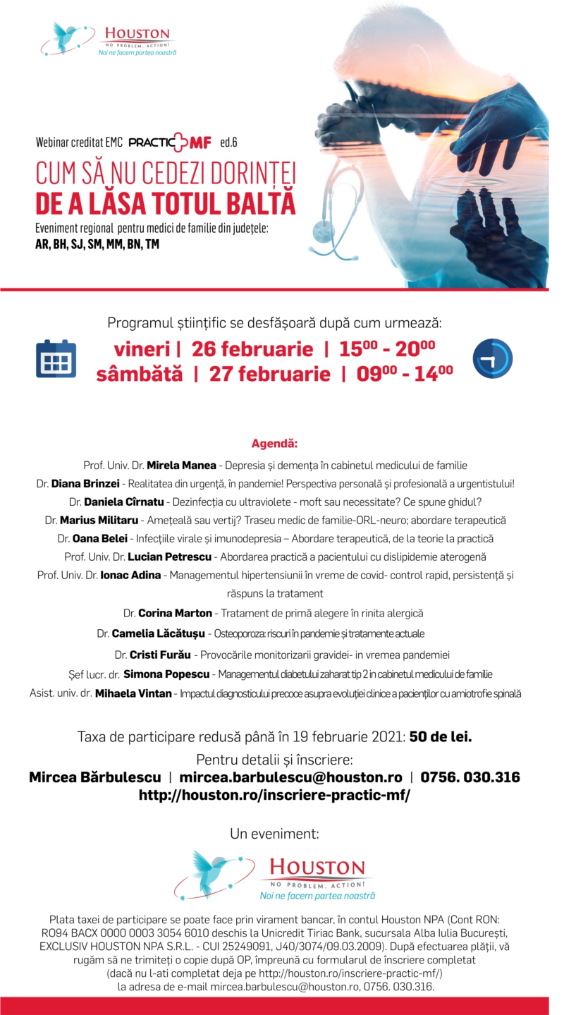 Vă așteptăm la @webinar Practic MF 26- 27 februarie, unde împreună cu colegii din alte specialități puteți aborda subiecte actuale la nivel practic care să vă ajute în activitatea zilnică.