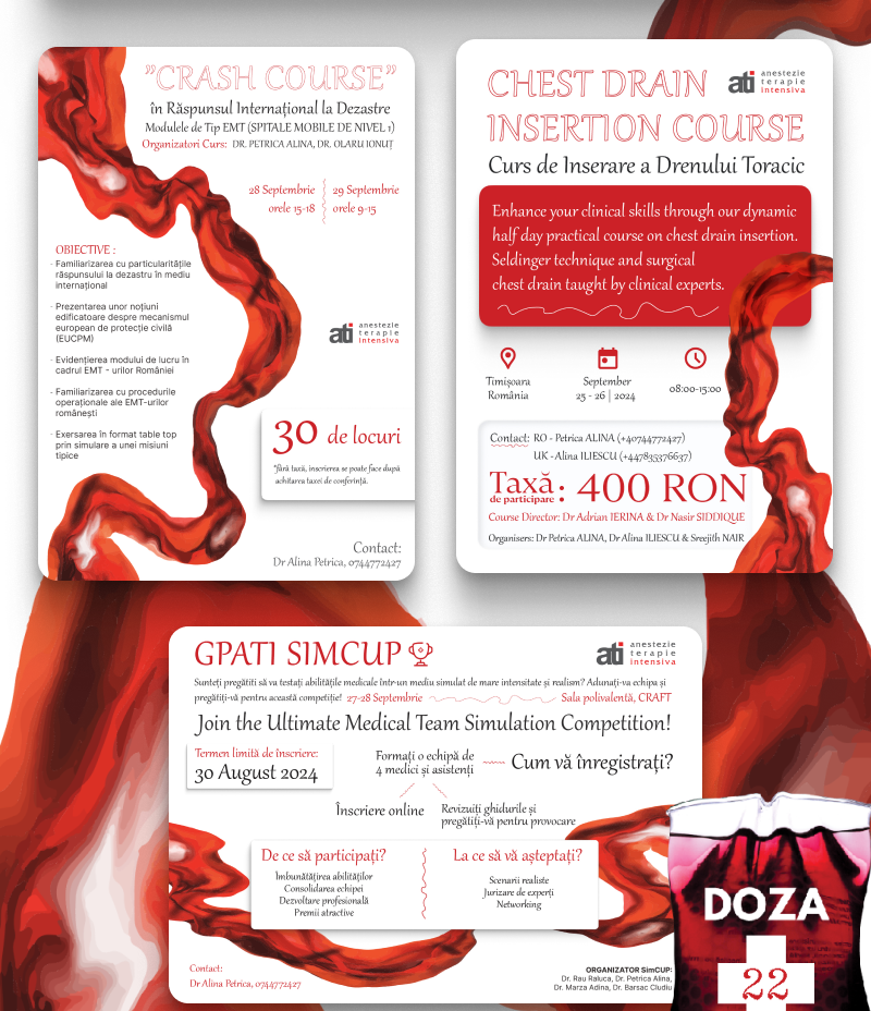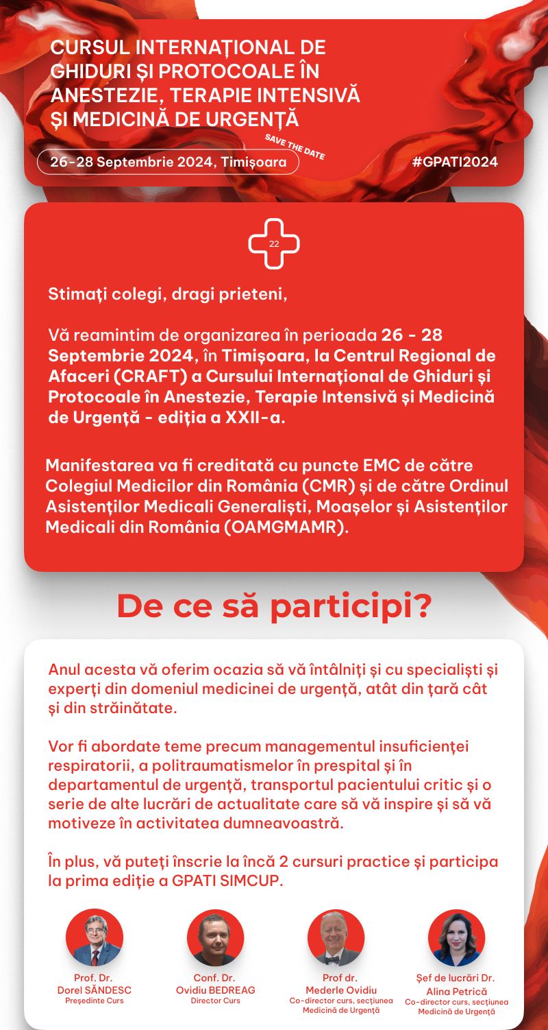 We are pleased to inform you that the prestigious International Course on Guidelines and Protocols in Anesthesia, Intensive Care, and Emergency Medicine – 22nd Edition, will return to Timișoara at the Regional Business Center (CRAFT) from September 26th to 28th, 2024.