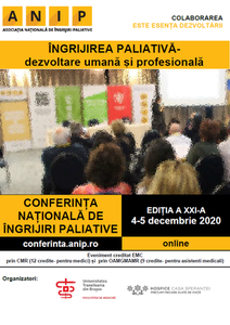 Perioada: 4 - 5 decembrie 2020Eveniment ONLINEOrganizatori: Universitatea Transilvania Brașov- Facultatea de Medicină & Asociația Națională de Îngrijiri Paliative & Fundația HOSPICE Casa Sp...