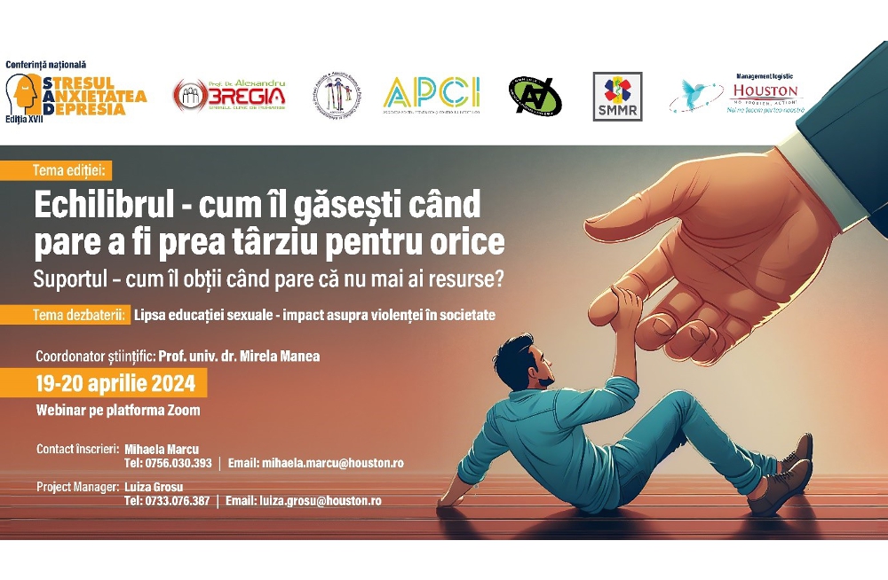 Ediția a XVII-a a Conferinței Stresul, Anxietatea și Depresia cu titlul: "Echilibrul - cum îl găsești când pare a fi prea târziu pentru orice. Suportul – cum îl obții când pare că nu mai ai resurse?” 2024