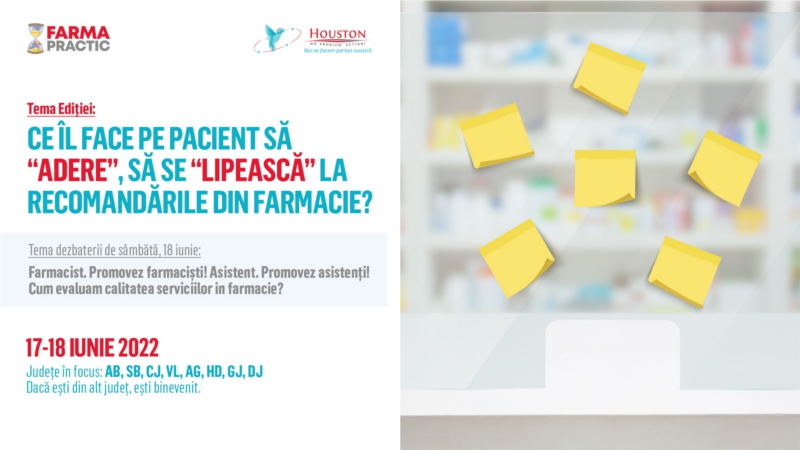 Ne vedem pe 17- 18 iunie la FarmaPractic- Ce îl face pe pacient să ”adere”, să se ”lipească” la recomandările din farmacie?, online pe ZOOM, să aprofundăm soluțiile pe care le ai la îndemână pentru a menține sau poate chiar pentru a crește încrederea pacienților în tine și în serviciile farmaceutice pe care le oferi.