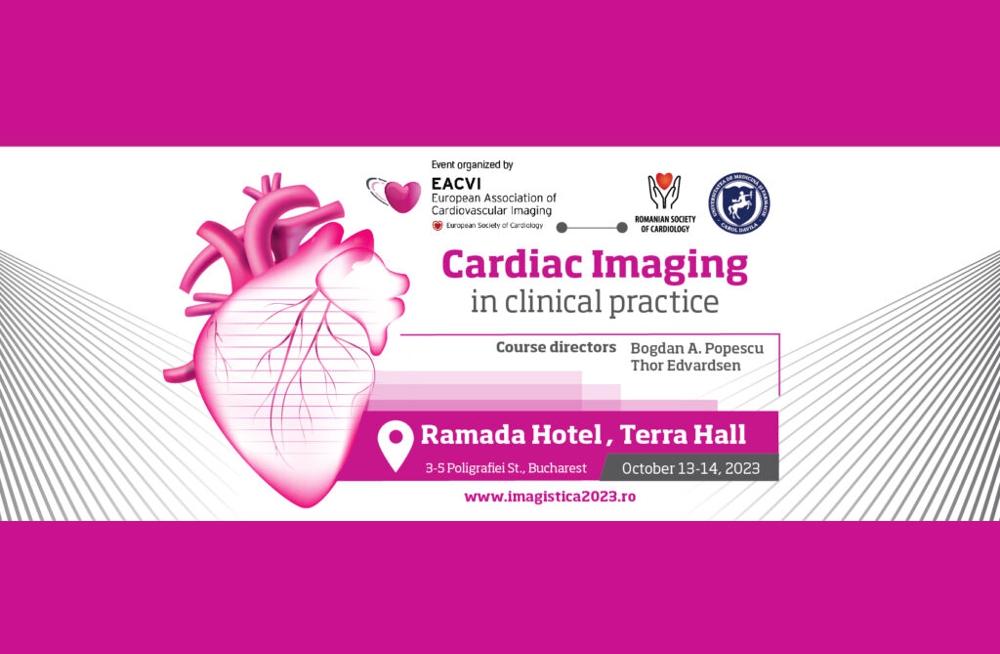 Afisari: 2096Societatea Română de Cardiologie și Asociația Europeană de Imaging Cardiovascular organizează un eveniment științific de nivel înalt cu tema ” Imagistică cardiacă în practică clinică”, curs cu ateliere hands-on, în perioada 13-14 octombrie 2023 la Hotel Ramada Plaza, București.