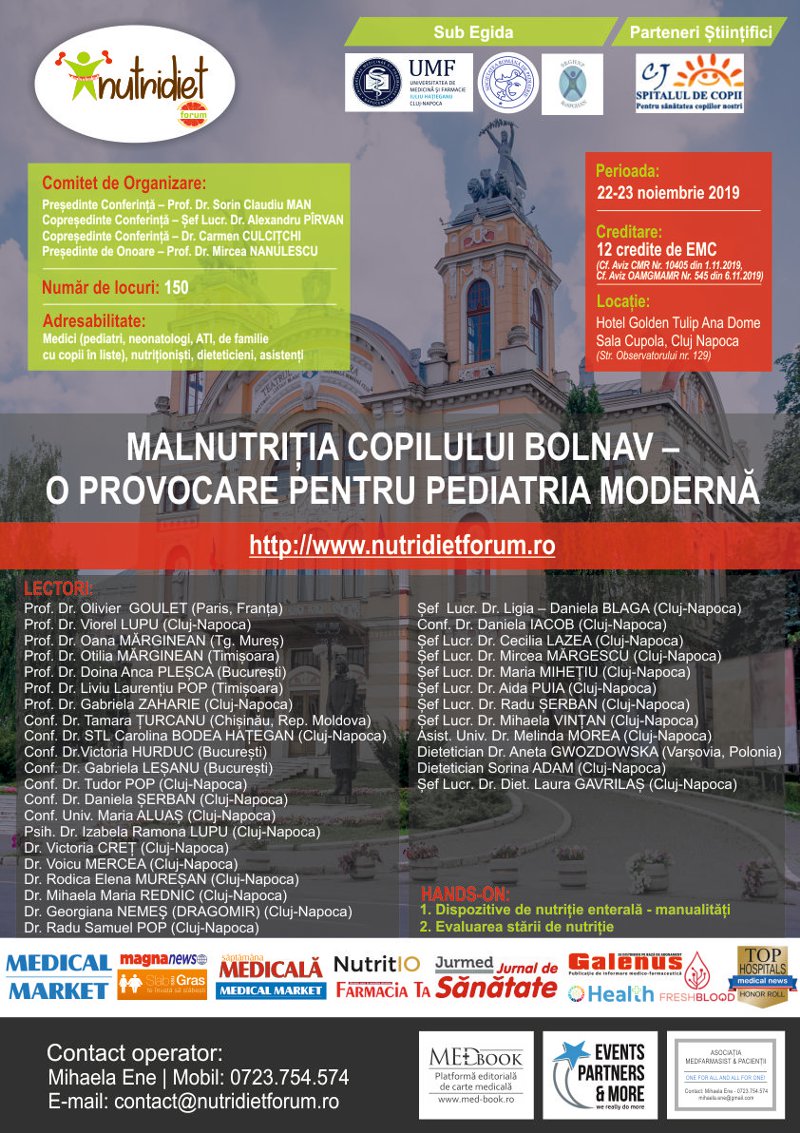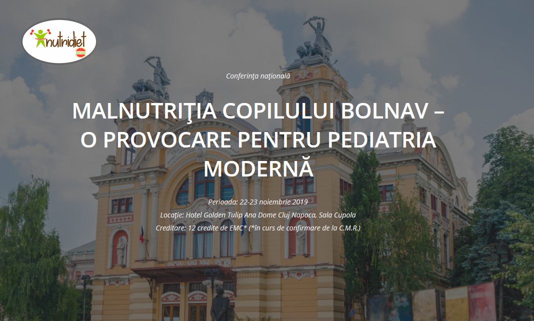 Avem bucuria de a vă invita anul acesta la Cluj-Napoca, în perioada 22-23 noiembrie 2019, pentru a participa la prima conferință pe tema bolilor asociate malnutriției la copil, considerând că pentru medicul pediatru asigurarea unei bune stări de nutriție a pacienților săi este la fel de importantă ca și asigurarea vindecării bolilor prin care aceștia trec.