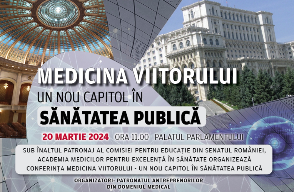 Sub înaltul Patronaj al COMISIEI PENTRU EDUCAȚIE din Senatul României, Academia Medicilor pentru Excelență în Sănătate – AMES, împreună cu Patronatul Antreprenorilor din Domeniul Medical, au deosebita onoare de a vă invita la Conferința cu titlul: MEDICINA VIITORULUI – UN NOU CAPITOL ÎN SĂNĂTATEA PUBLICĂ, care va avea loc Miercuri, 20 martie 2024, începând cu ora 11:00, online, prin aplicatia ZOOM.