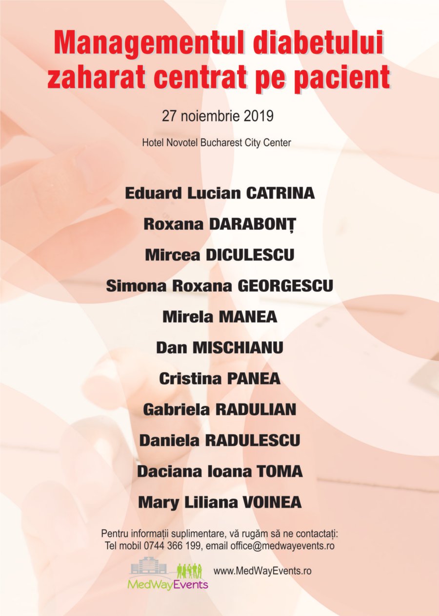 Afisari: 3355In data de 27 noiembrie 2019 la Novotel Bucharest City Center va avea loc prima conferinta medicala cu tema „MANAGEMENTUL DIABETULUI ZAHARAT - CENTRAT PE PACIENT”. Conferinta va fi coordonata stiintific de doamna Prof. Univ. Gabriela Radulian si va fi organizata sub egida Universității de Medicină și Farmacie ``Carol Davila`` București si a Academiei de Stiinte Medicale.
