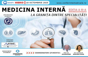 18 OCTOMBRIE 2025, HIBRIDCONFERINȚĂ CREDITATĂ CU CREDITE EMC ȘI CREDITE EFCStimați colegi,Este o mare bucurie și onoare să vă invităm la a treia ediție a conferinței „ Medicina Internă –...