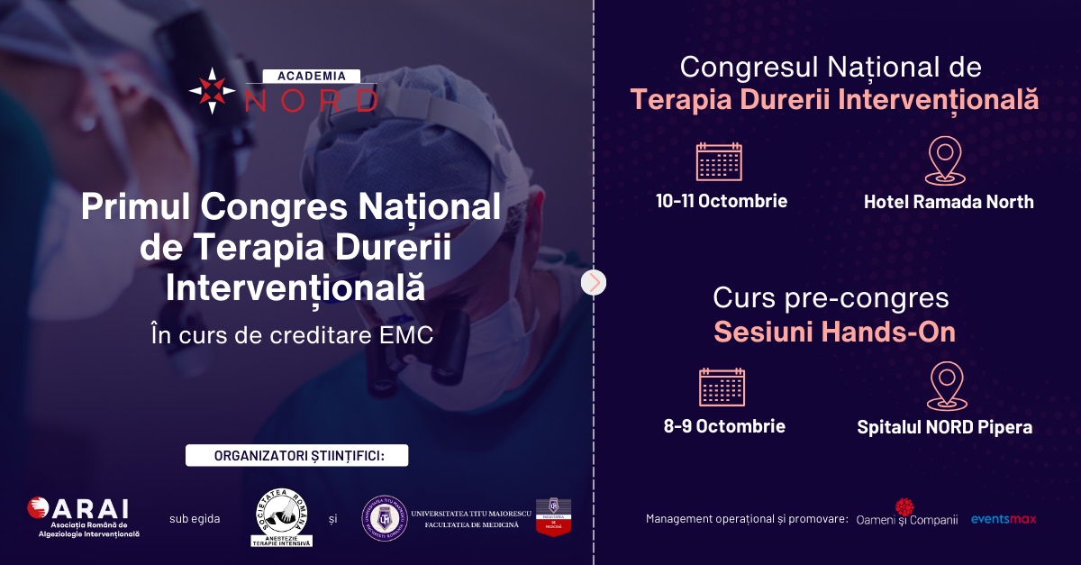 Programul Congresului Național de Terapia Durerii Intervențională va include și un Curs pre-congres (sesiuni hands-on pe specimene umane), care va avea loc marți, 8 octombrie și miercuri, 9 octombrie, la Spitalul NORD Pipera.