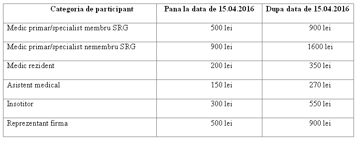 Valoarea taxei difera in functie de tipul de participant si termenul in care este platita, conform tabelului de mai jos: