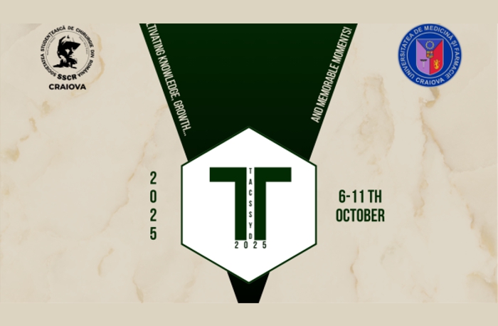 Afisari: 747În perioada 6-10 octombrie 2025, la Universitatea de Medicină și Farmacie din Craiova va avea loc cea de-a VIII-a ediție a TACSSYD – The Annual Congress of Surgery for Students and Young Doctors, organizată de Societatea Studențească de Chirurgie din România, Filiala Craiova (SSCR Craiova).