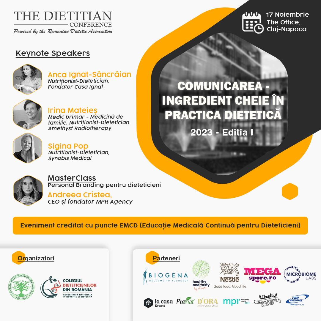 Prima ediție a conferinței The Dietitian, ce abordează tema „Comunicarea – Ingredient cheie în practica dietetică,” se va desfășura în format fizic pe data de 17 noiembrie 2023, la The Office, în Cluj-Napoca. La evenimentul academic sunt așteptați profesioniști din domeniul nutriției și dieteticii, precum și absolvenți ai studiilor de licență în specializarea Nutriție și Dietetică, dar și studenții care urmează această specializare din universitățile de profil din țară.